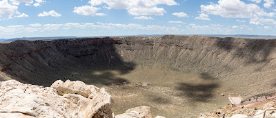 We reden in anderhalf uur tot Meteor Crater, nog voorbij Flagstaff, onze eindbestemming voor vandaag. Zo'n 50 000 jaar geleden sloeg een meteoriet een gigantische krater, 1.2km in diameter, in een vlak landschap, gekenmerkt als de grote leegte.