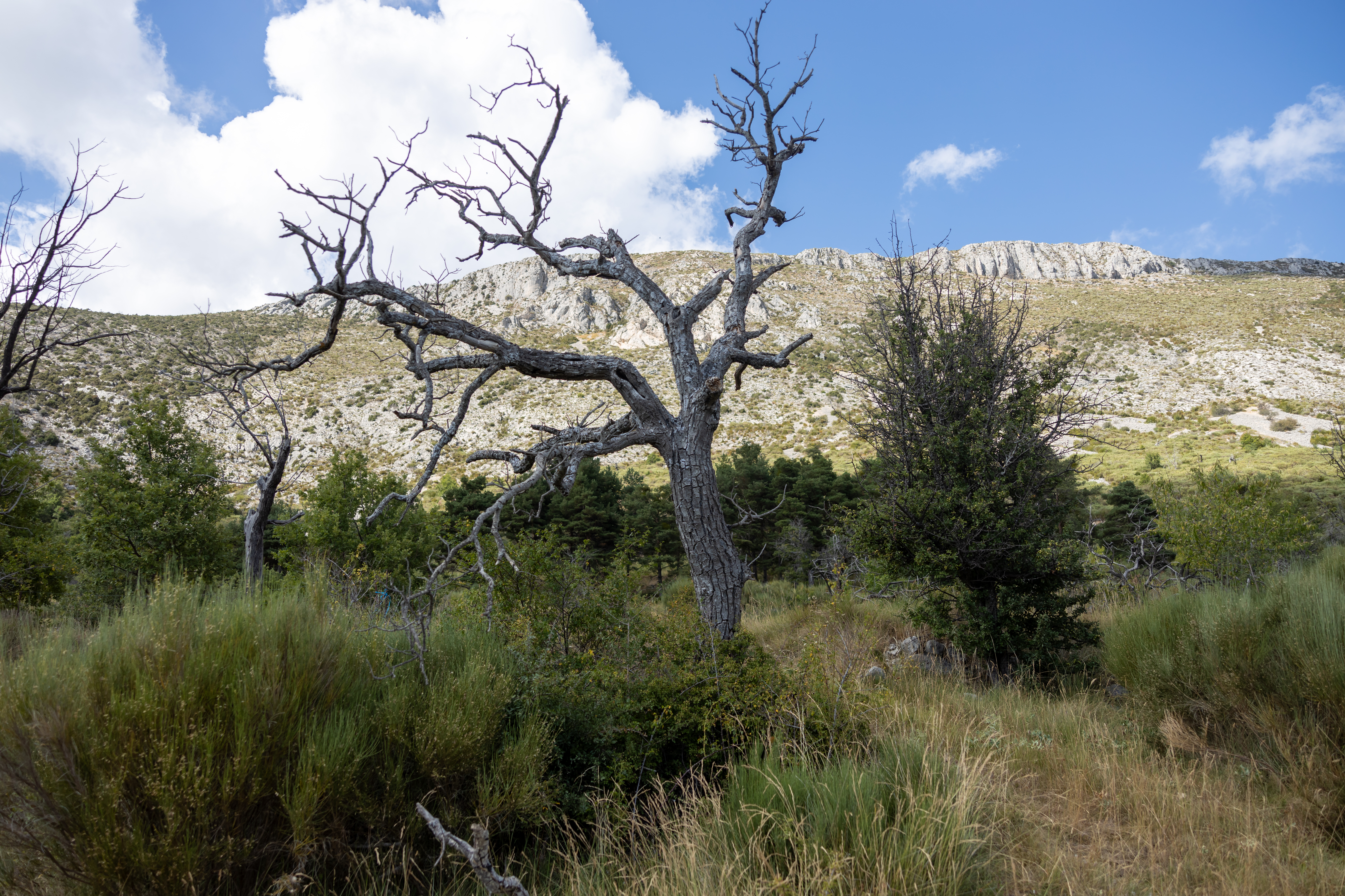 Onze poging om de wandeling wat uit te breiden, strandde in het hoge, dorre prikkegras bij een bordje dat aangaf dat we niet verder mochten. Zo moesten we terug naar boven, om terug aansluiting te vinden op de route van daarstraks.
